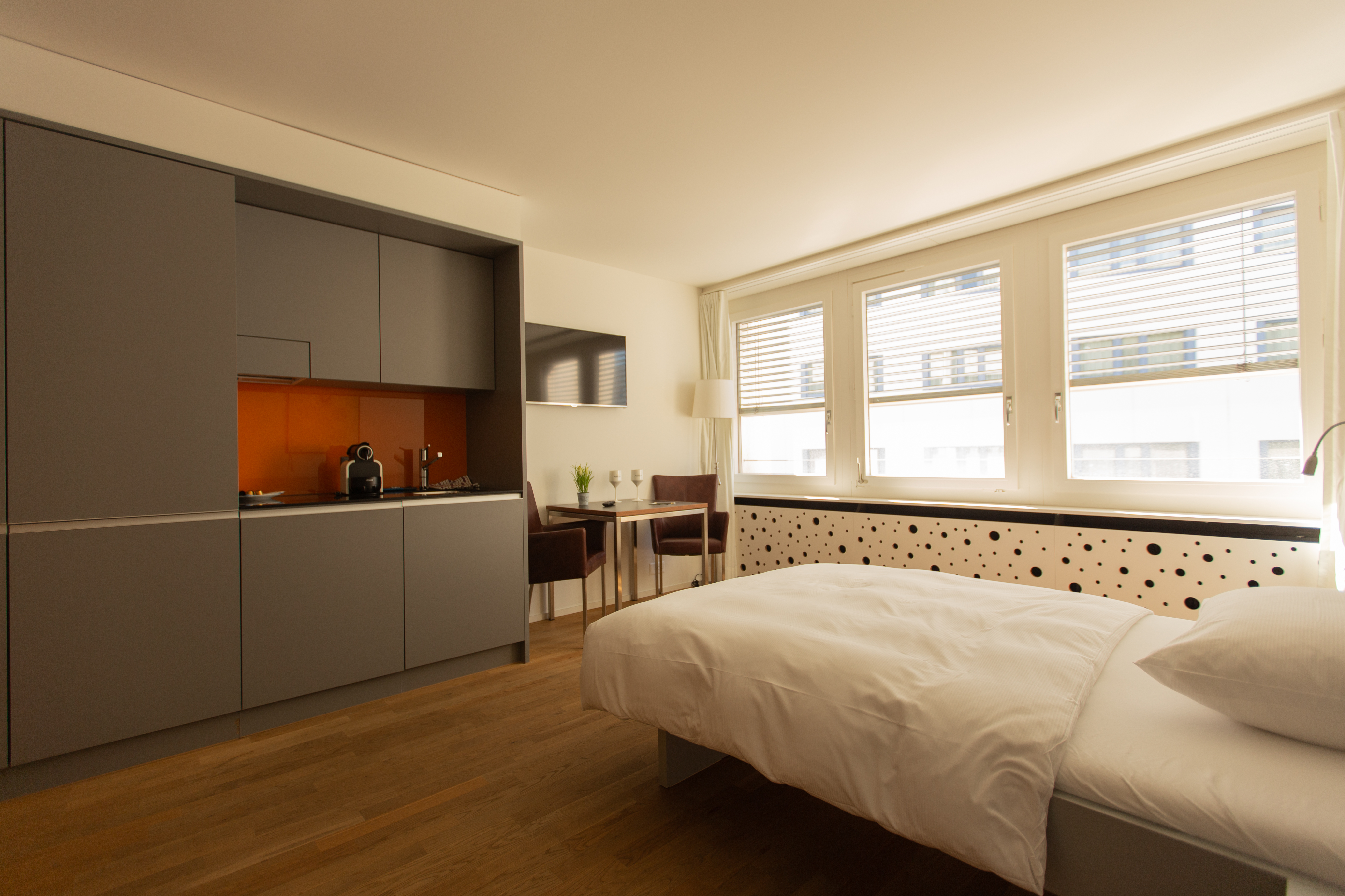 Unsere 34 möblierten 1-Zimmer-Wohnungen bieten Wohnflächen zwischen 16 und 25 Quadratmetern und liegen in unmittelbarer Nähe zur Messe Basel und zum Kongresszentrum. Von hier aus gelangen Sie bequem zu Fuss in die charmante Altstadt, an das Rheinufer sowie zu zahlreichen Supermärkten, Geschäften und Restaurants. Die zentrale Lage unserer Apartments macht sie zur perfekten Wahl für alle, die Wert auf Komfort und kurze Wege legen.