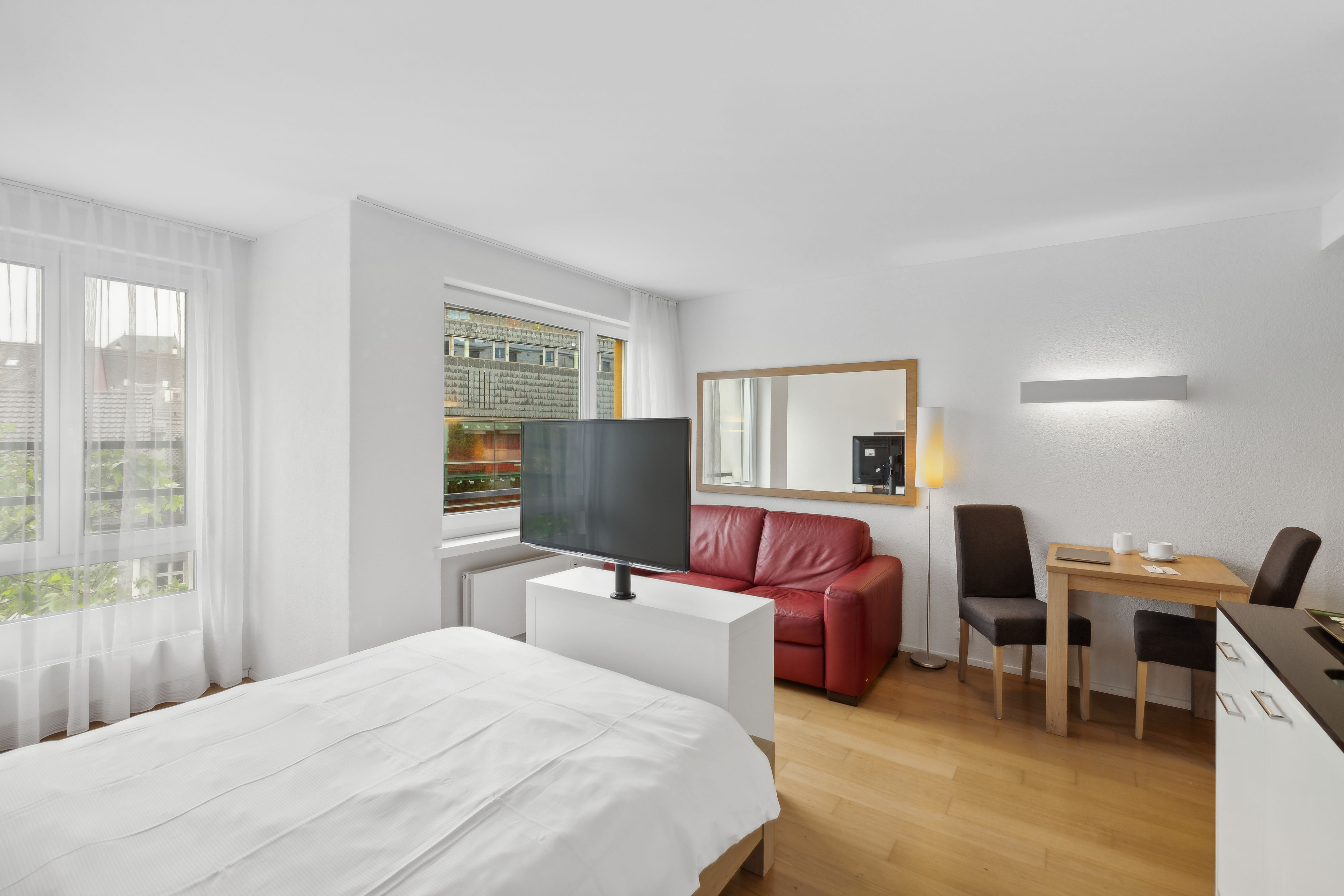 Unsere 63 möblierten Studios sind zwischen 24 und 37 Quadratmeter gross und mit allem Komfort ausgestattet, um Ihren Aufenthalt so angenehm wie möglich zu gestalten. Sie verfügen über eine offene Küche und ein Badezimmer sowie elektrische Storen. Zur Reinigung und Pflege Ihrer Wäsche steht Ihnen im Apartment ein praktisches Kombigerät für Waschen und Trocknen zur Verfügung. Was wünscht man sich mehr?