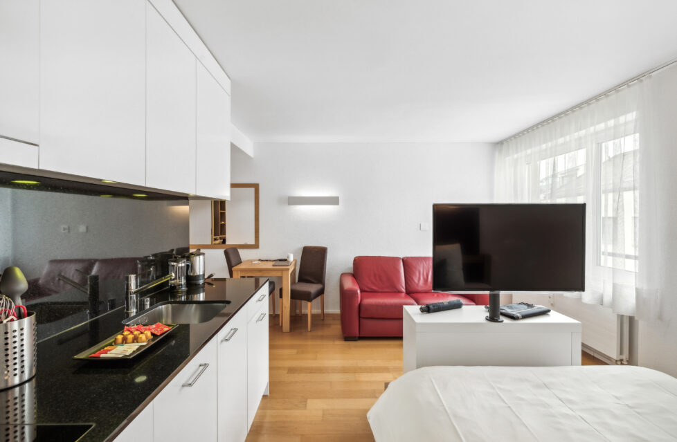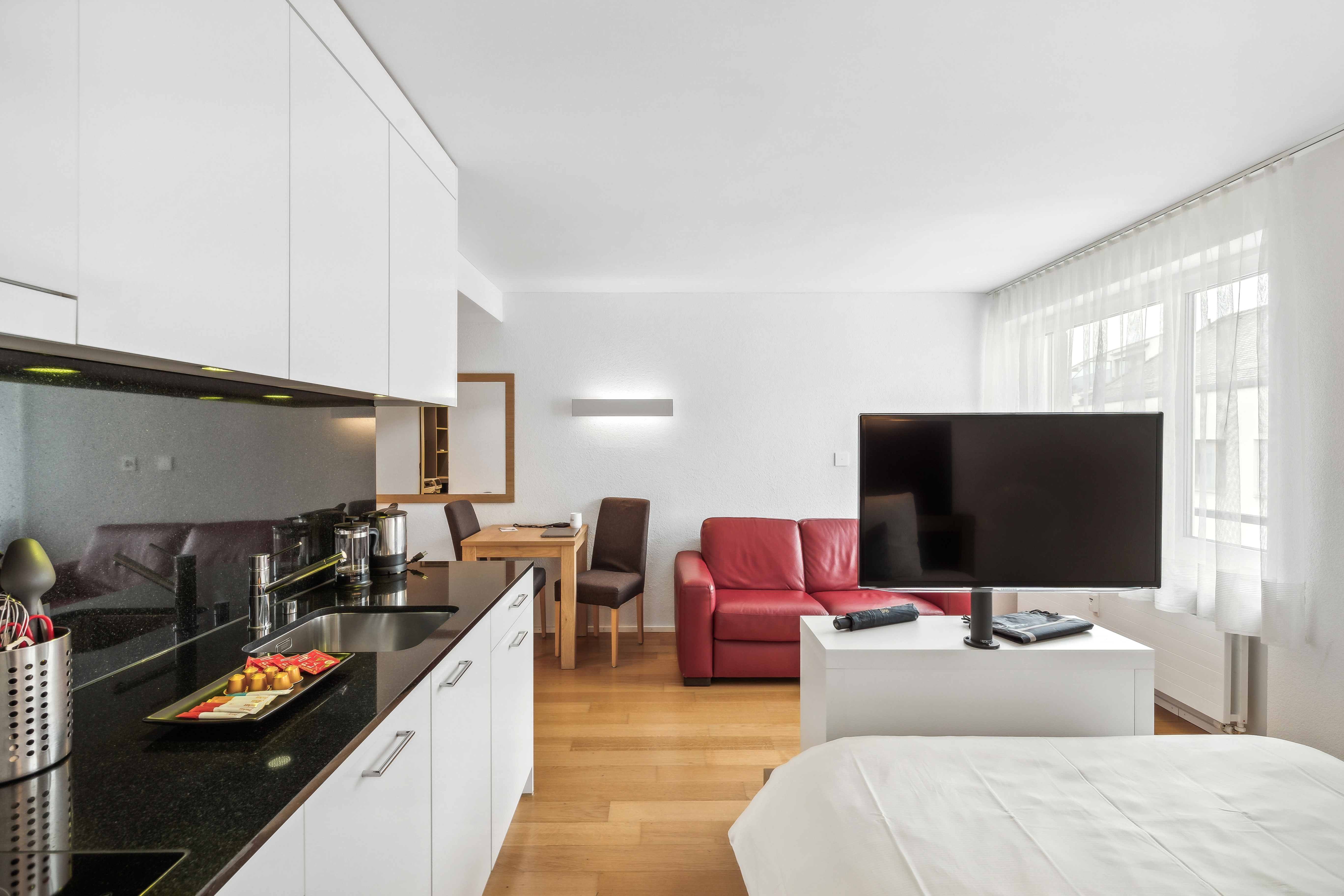 Unsere 63 möblierten Studios sind zwischen 24 und 37 Quadratmeter gross und mit allem Komfort ausgestattet, um Ihren Aufenthalt so angenehm wie möglich zu gestalten. Sie verfügen über eine offene Küche und ein Badezimmer sowie elektrische Storen. Zur Reinigung und Pflege Ihrer Wäsche steht Ihnen im Apartment ein praktisches Kombigerät für Waschen und Trocknen zur Verfügung. Was wünscht man sich mehr?