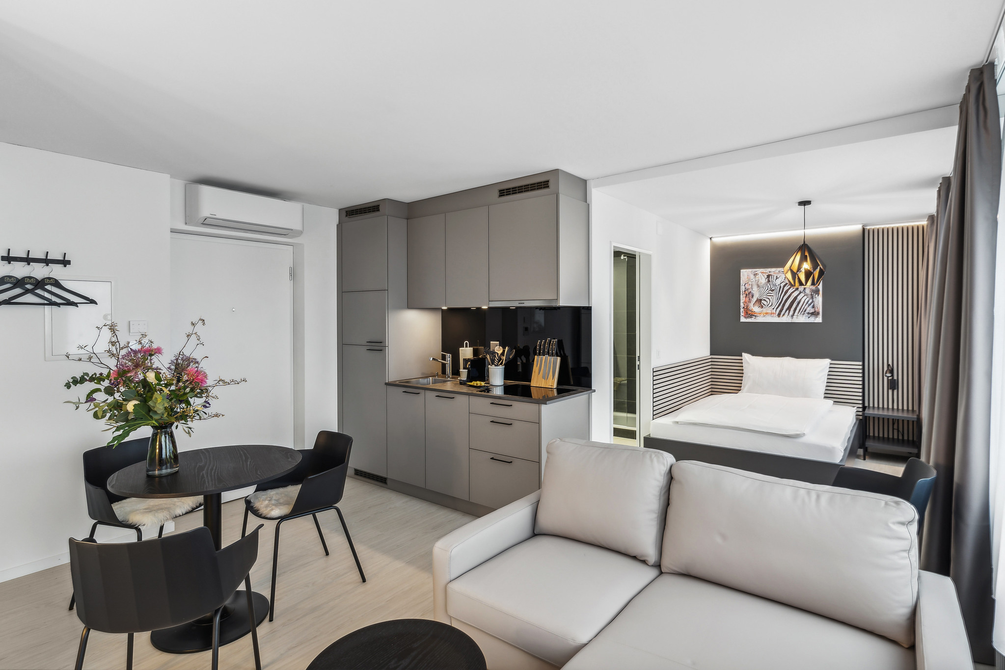 «Holzikofen» umfasst 24 hochwertig eingerichtete 1- bis 2-Zimmer-Wohnungen an guter Lage am Holzikofenweg 8. Die möblierten Apartments sind mit allem Komfort ausgestattet, um Ihren Aufenthalt so angenehm wie möglich zu gestalten. Die Wohnungen sind zwischen 24 und 58 Quadratmeter gross, klimatisiert, verfügen über elektrische Storen und werden mit Solarstrom betrieben. Es ist möglich, Parkplätze in der Tiefgarage zu mieten.
