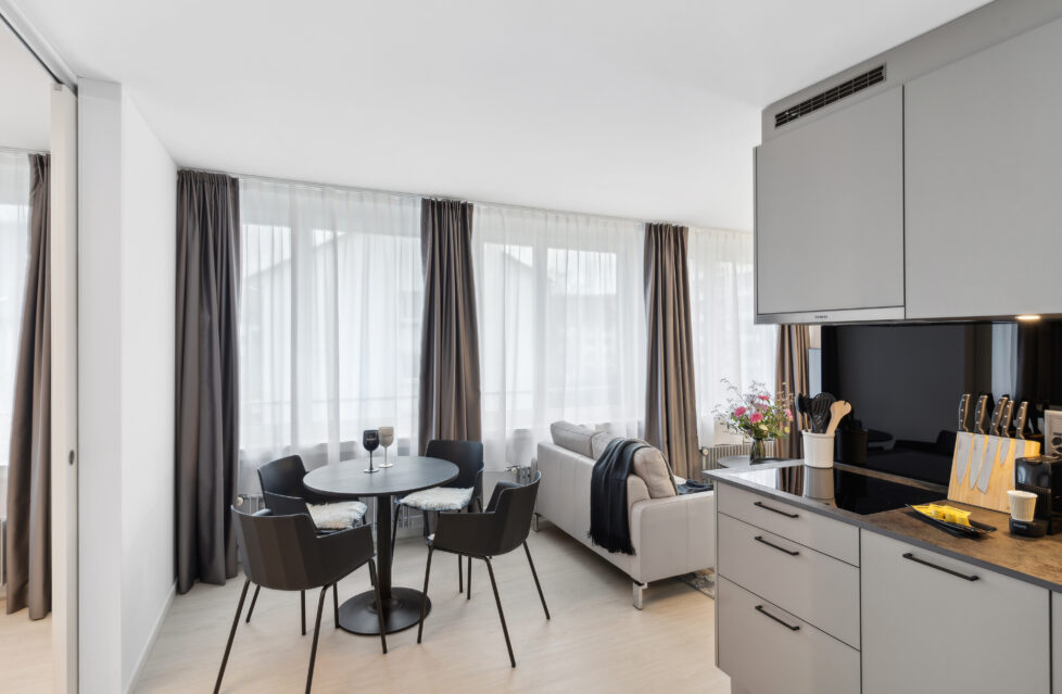 The Holzikofen accommodates 24 1 to 2-room apartments in an attractive location at Holzikofenweg 8. The apartments each measure between 24 and 58 square metres and come fully equipped with every comfort to ensure an enjoyable stay. All apartments are air-conditioned, have electric blinds and are powered by solar power. It is possible to rent parking spaces in the underground car park.