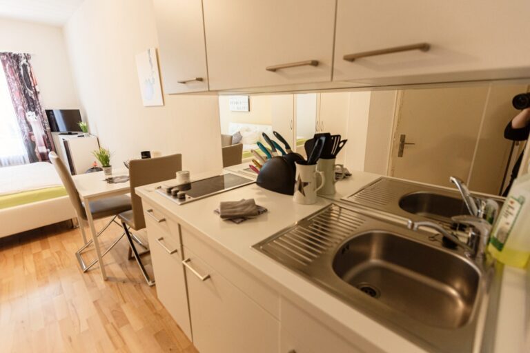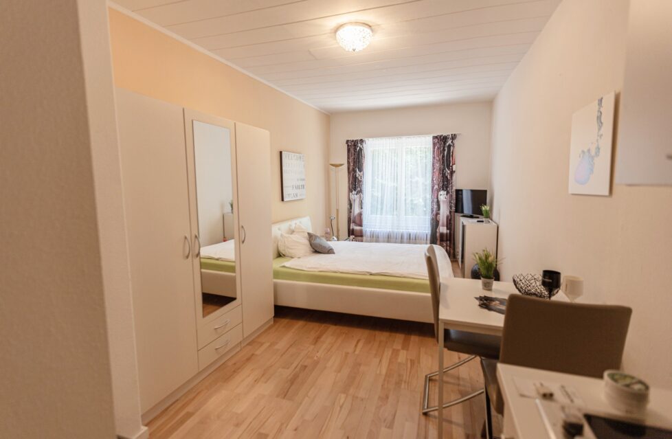 Step inside and immediately feel at ease – experience the relaxed atmosphere of the Felsental apartment building. Situated in green surroundings, the three-storey building features a spacious communal terrace with a garden barbecue area. Each of the 25 rooms and studios are furnished, measure between 13 and 47 square metres, and come with their own bathroom, and, in some instances, a kitchenette. There are two fully equipped kitchens available for shared use.